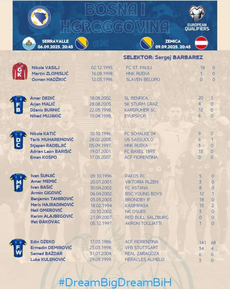 Nogometna „A“ reprezentacija Bosne i Hercegovine u septembru nastavlja kvalifikacije za Svjetsko prvenstvo utakmicama sa San Marinom i Austrijom.