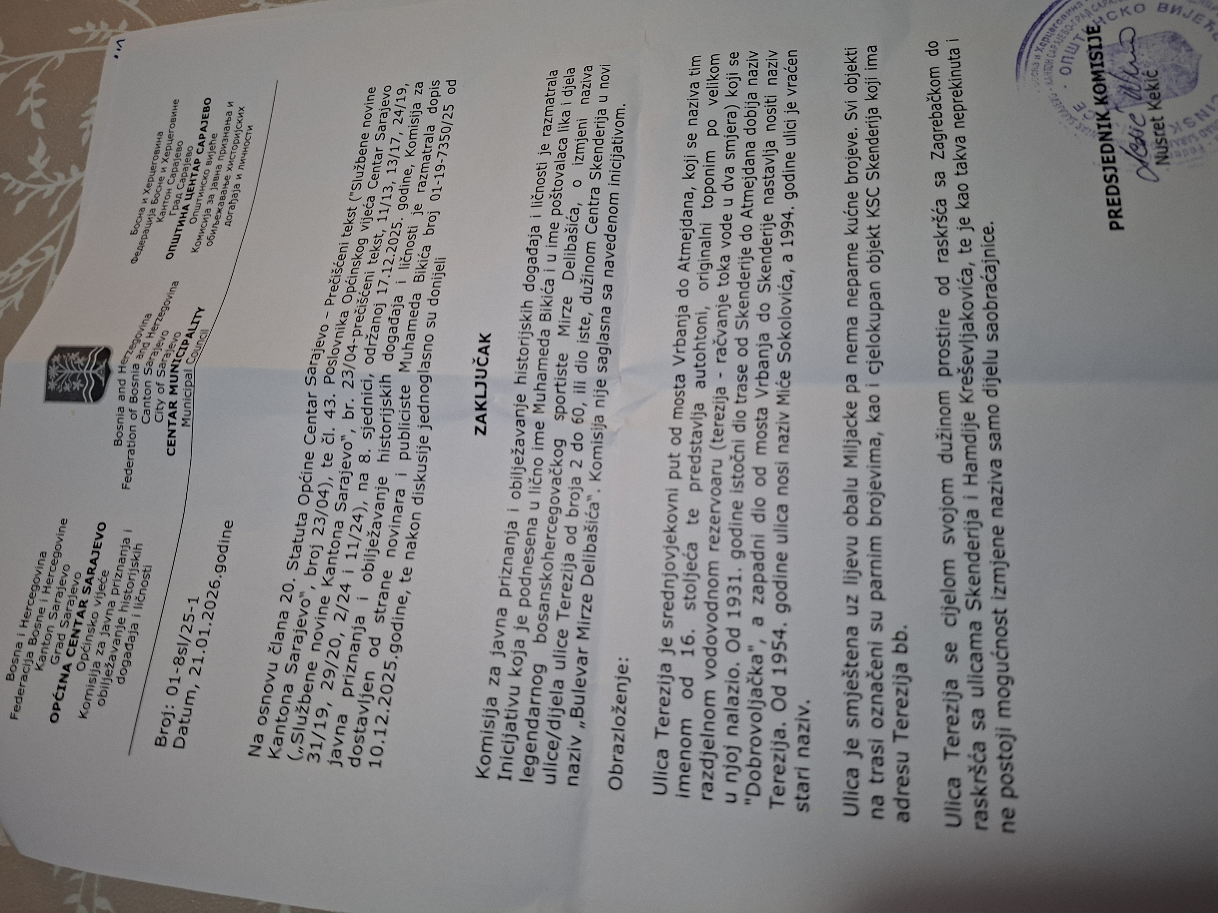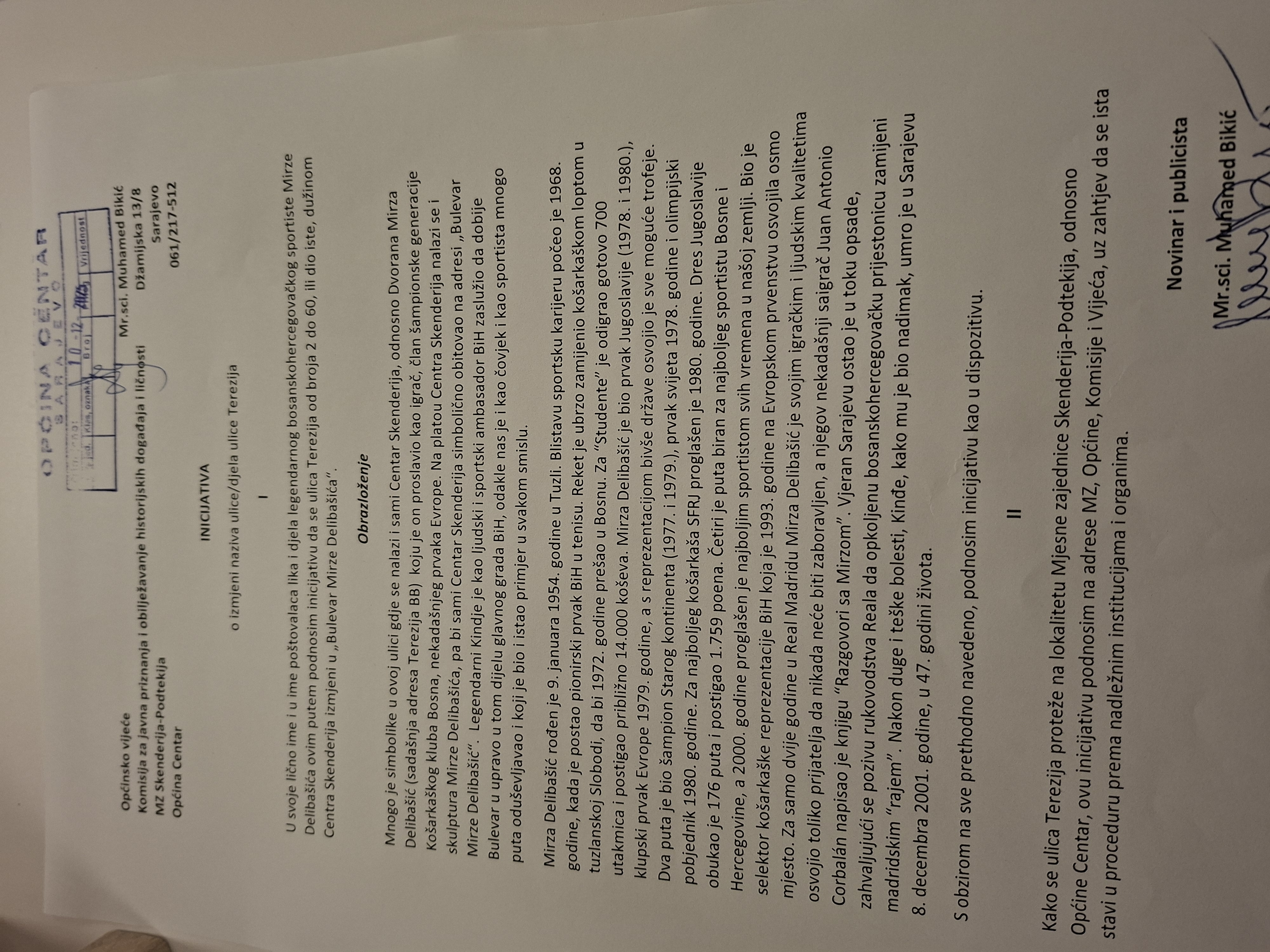 Komisija za javna priznanja i obilježavanje historijskih događaja i ličnosti Općine Centar nije saglasna sa inicijativom o izmjeni naziva ulice/dijela ulice Terezija od broja 2 do 60, ili dio iste, dužinom Centra Skenderija u novi naziv „Bulevar „Mirze Delibašića", a koju je podnio u lično ime novinar i publicista Muhamed Bikić i u ime poštovalaca lika i djela legendardnog bh. sportiste Mirze Delibašića.