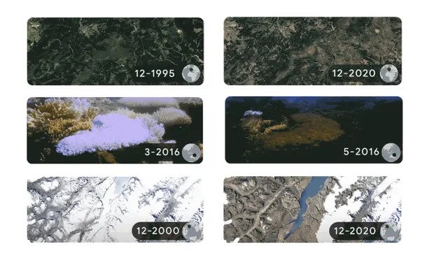Google obilježava Dan planete Zemlje satelitskim snimkama s vremenskim odmakom koje prikazuju otapanje glečera, povlačenje snježnog pokrivača, krčenje šuma i izbjeljivanje koralja kako bi svoje korisnike podsjetio na utjecaj čovječanstva na klimu i okoliš.