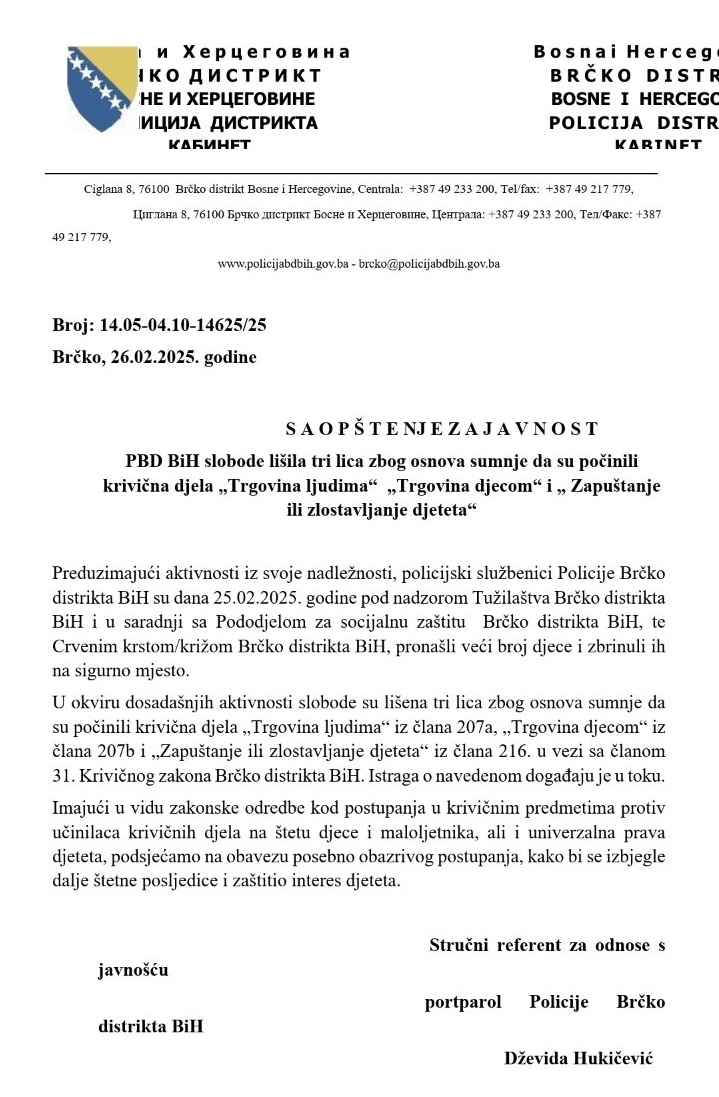 Na području Distrikta Brčko, u naselju Ivici, pronađeno je 31 dijete uzrasta od 0 do 12 godina. PBD BiH lišila je slobode tri lica, zbog osnova sumnje da su počinili krivična djela "Trgovinu ljudima" "Trgovina djecom" i "Zapuštanje ili zlostavljanje djeteta". Kako FTV saznaje, među uhapšenima su sudski policajac i njegova majka. Djeca nemaju bh. dokumente.