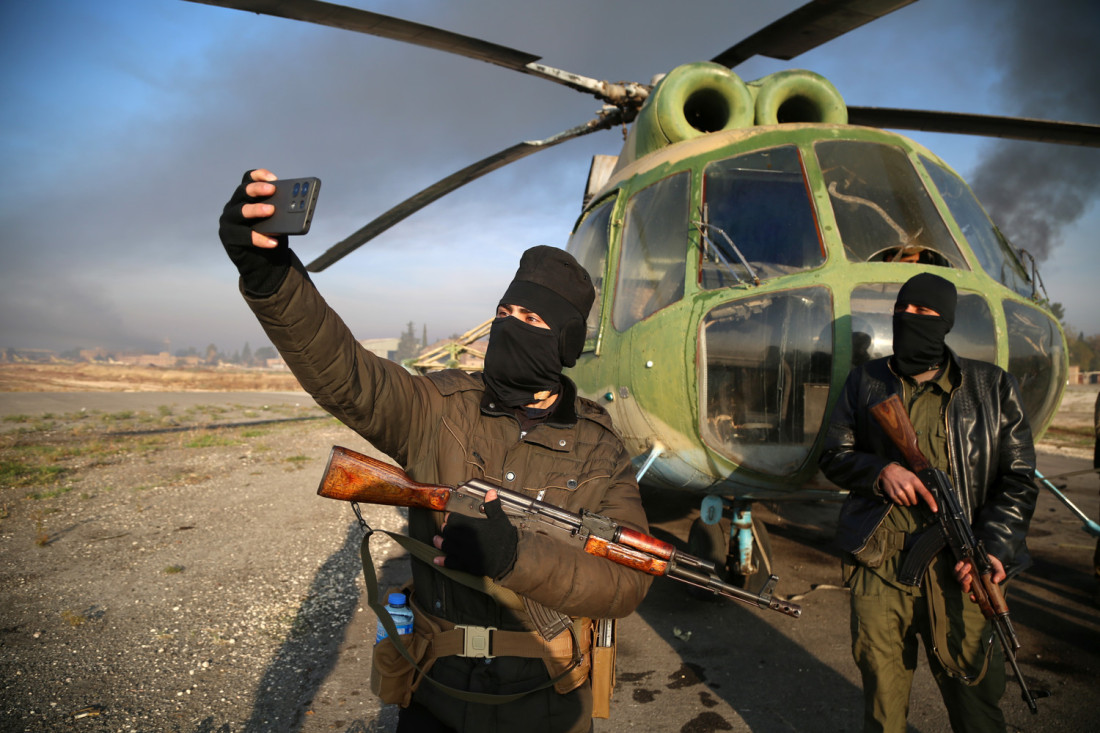 Naoružani muškarci prave selfije na vojnom aerodromu Nayrab u Alepu, Sirija, 2. decembra 2024. Foto: EPA/BILAL AL HAMMOUD