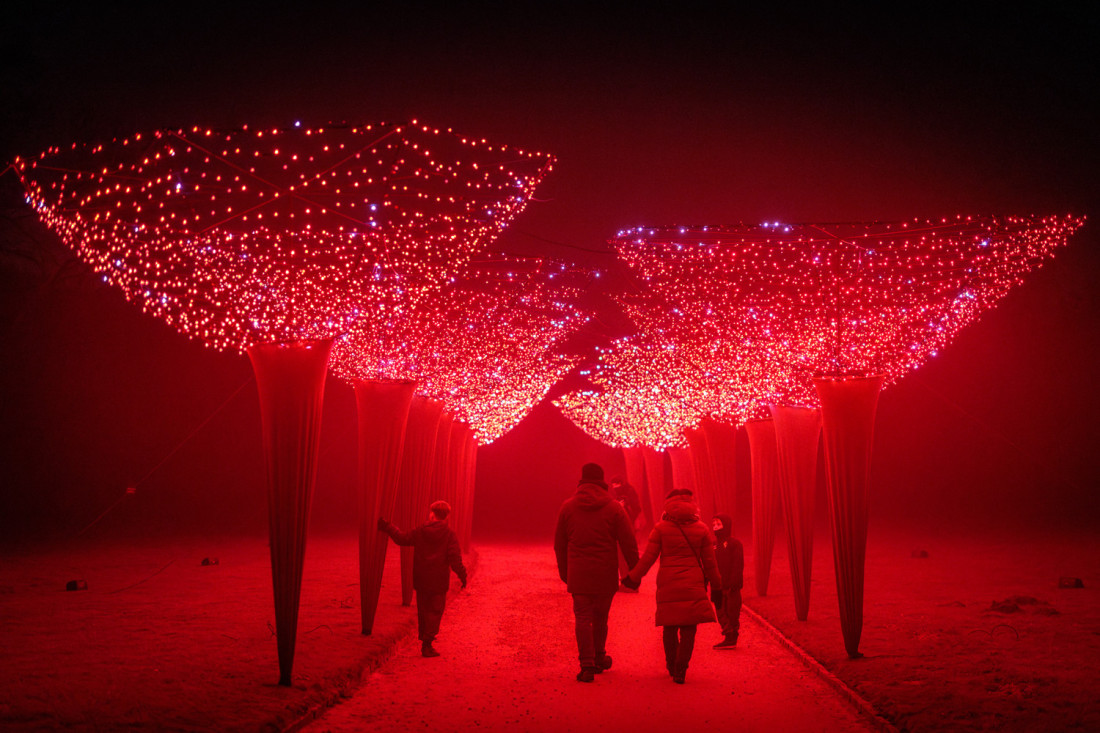Posjetioci u noćnoj šetnji festivala svjetla WinterFloridylle u Botaničkom vrtu u Meiseu, Belgija, 28. decembra 2024. Foto: EPA/OLIVIER MATTHYS