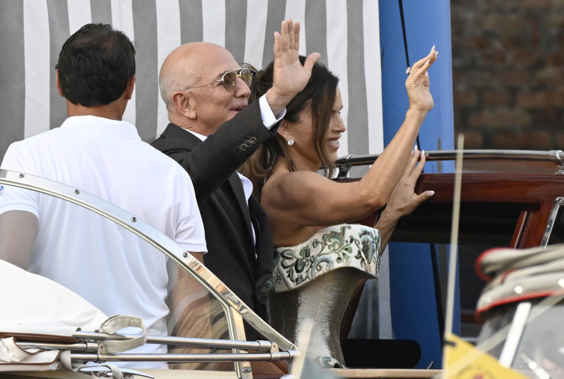 Osnivač Amazona Jeff Bezos i njegova zaručnica Lauren Sanchez mašu okupljenima dok napuštaju hotel Aman kako bi prisustvovali zabavi u Veneciji, Italija, 26. juna 2025. godine, na dan kada bi trebalo početi njihovo vjenčanje. Foto: EPA/DANIEL DAL ZENNARO