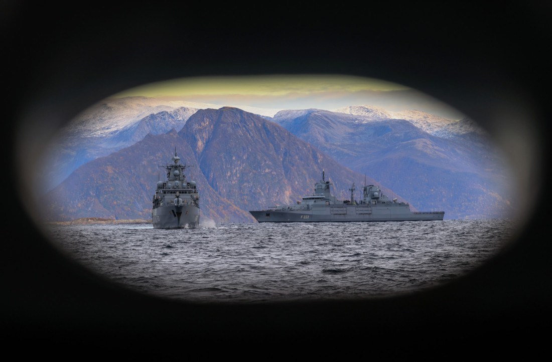 Njemačke mornaričke fregate Bayern (Bavarska) i Baden-Wuerttemberg (R) plove blizu Harstada, Norveška, 13. oktobra 2025. Foto: EPA/HANNIBAL HANSCHKE