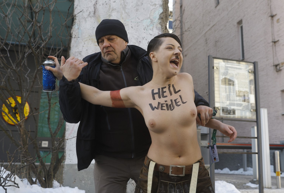 Osiguranje intervenira dok aktivistica ukrajinske feminističke grupe FEMEN oponaša Adolfa Hitlera protestujući protiv stranke Alternativa za Njemačku (AfD) i njene liderke Alice Weidel, na dan održavanja saveznih izbora u Njemačkoj, ispred njemačke ambasade u Kijevu, Ukrajina, 23. februara 2025. Foto: EPA/SERGEY DOLZHENKO