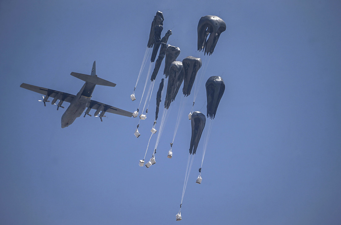 Zračne snage Ujedinjenih Arapskih Emirata (UAE) 27. jula 2025. godine dostavljaju humanitarnu pomoć iznad sjevernog Pojasa Gaze. Više od 130 Palestinaca, od kojih su većina djeca, umrlo je od pothranjenosti u Pojasu Gaze, saopštilo je palestinsko Ministarstvo zdravstva 27. jula. Foto: EPA/MOHAMMED SABER