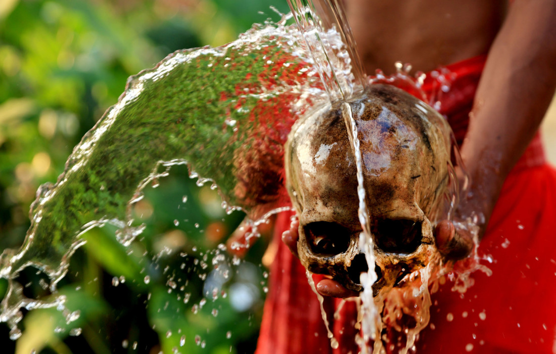 Hinduist čisti ljudsku lobanju tokom svetog marša Gajan festivala u selu Shilinda, istočna Indija, 14. aprila 2025. Foto: EPA/PIYAL ADHIKARY