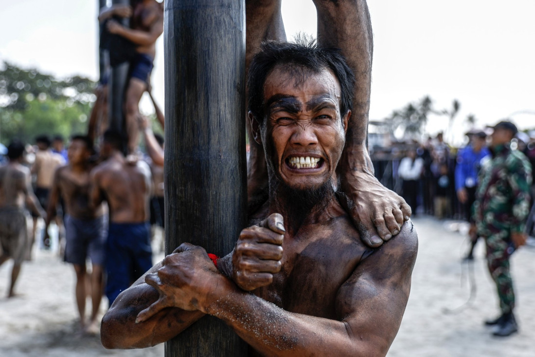 Reakcija učesnika tokom utrke penjanja na motku, lokalno poznate kao 'Panjat Pinang', povodom proslave 80. Dana nezavisnosti na plaži Ancol u Džakarti, Indonezija, 17. augusta 2025. Foto: EPA/MAST IRHAM