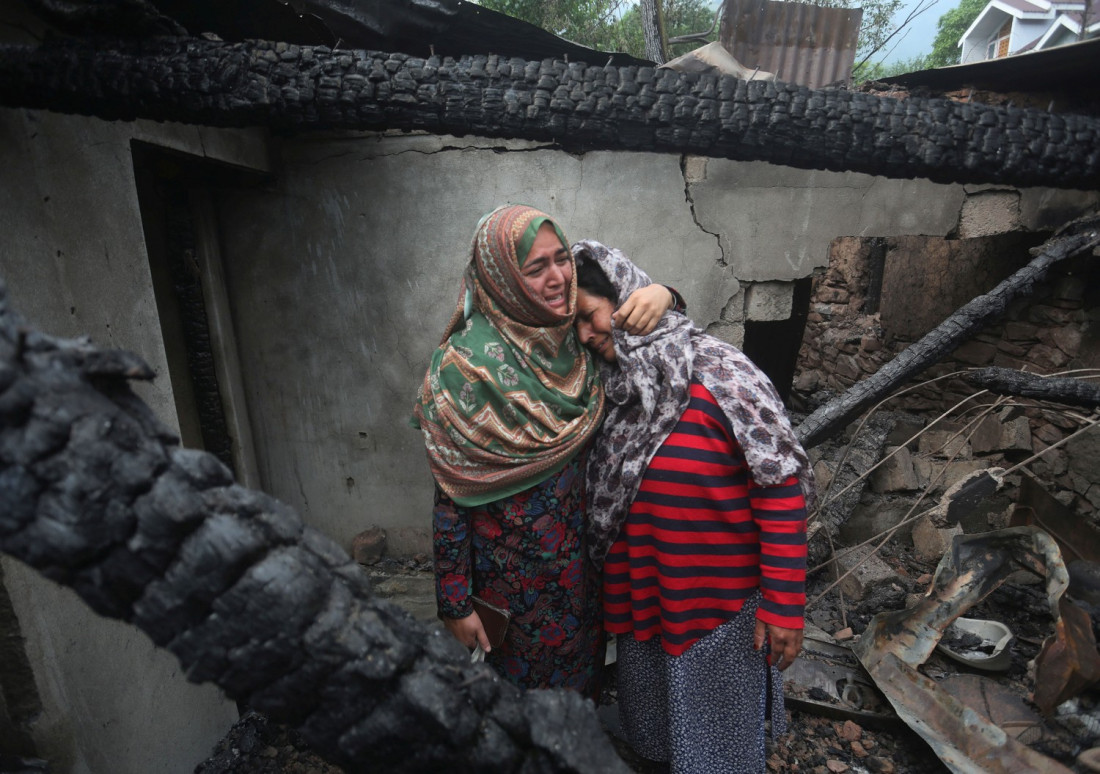 Žene u Kashmiru plaču u svojoj kući oštećenoj nakon prekograničnog granatiranja iz Pakistana, u selu Salamabad u Uriju. 8. maja 2025. Foto: EPA/FAROOQ KHAN