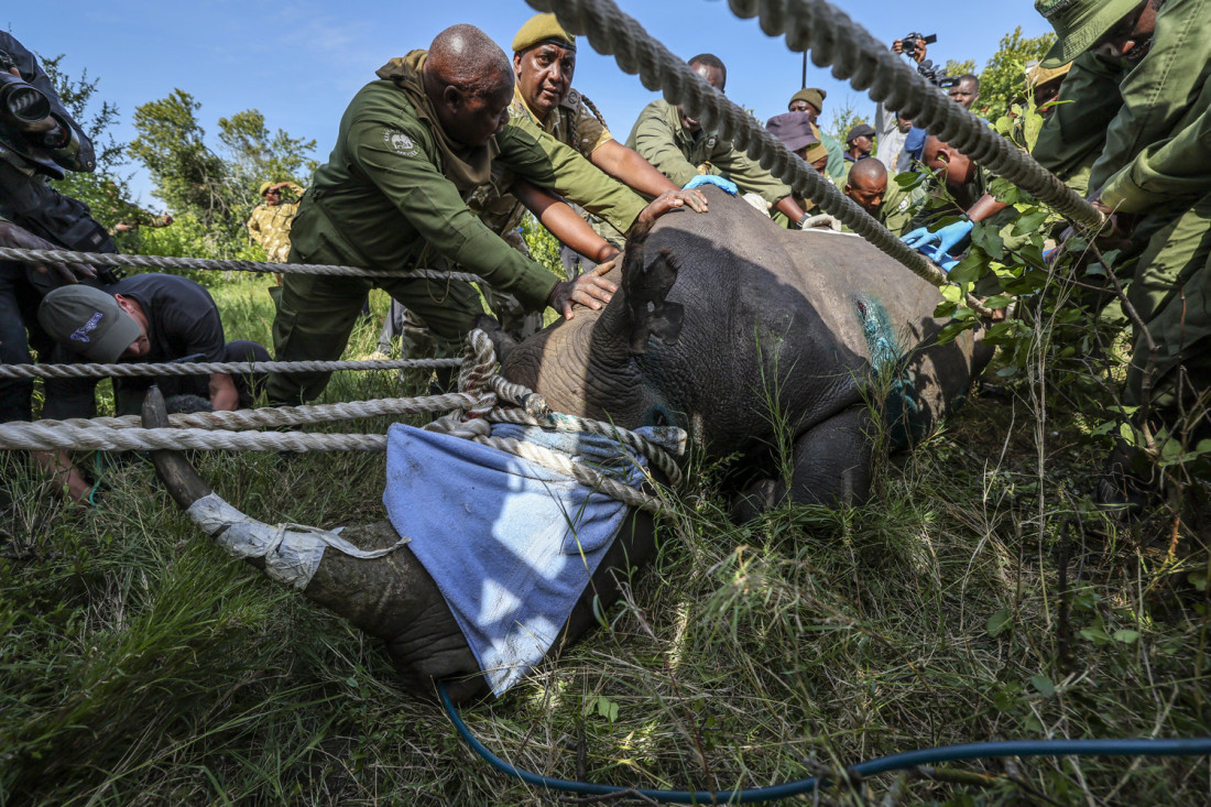 Članovi Kenijske službe za divlje životinje (KWS) i veterinarski timovi brinu se o jednom od crnih nosoroga uhvaćenih prvog dana preseljavanja 21 kritično ugroženog crnog nosoroga iz rezervata Ol Pejeta u rezervat Segera, u Nanyukiju, Kenija, 24. maja 2025. Foto: EPA/DANIEL IRUNGU