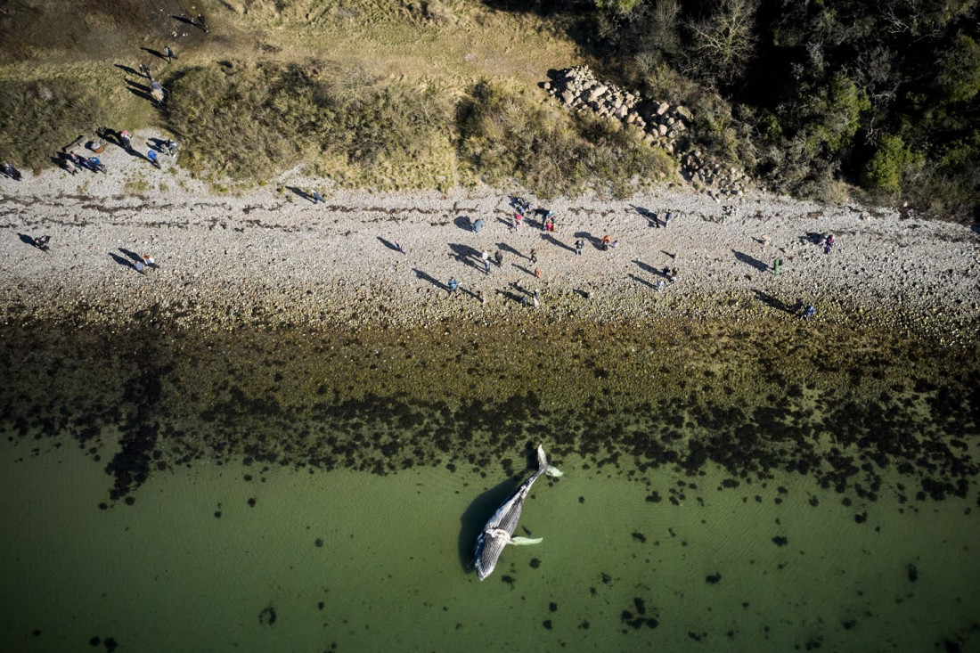 Fotografija dronom prikazuje mrtvog grbavog kita u Foelle Strandu u zalivu Loegten, Danska, 2. aprila 2025. Foto: EPA/MIKKEL BERG PEDERSEN