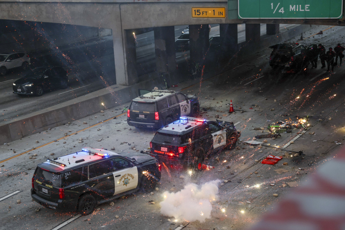 Policajci se skrivaju dok aktivisti zasipaju kamenjem i vatrometom njihova vozila tokom protesta izazvanih imigracijskim racijama u Los Angelesu, Kalifornija, SAD, 8. juna 2025. Foto: EPA/ALLISON DINNER