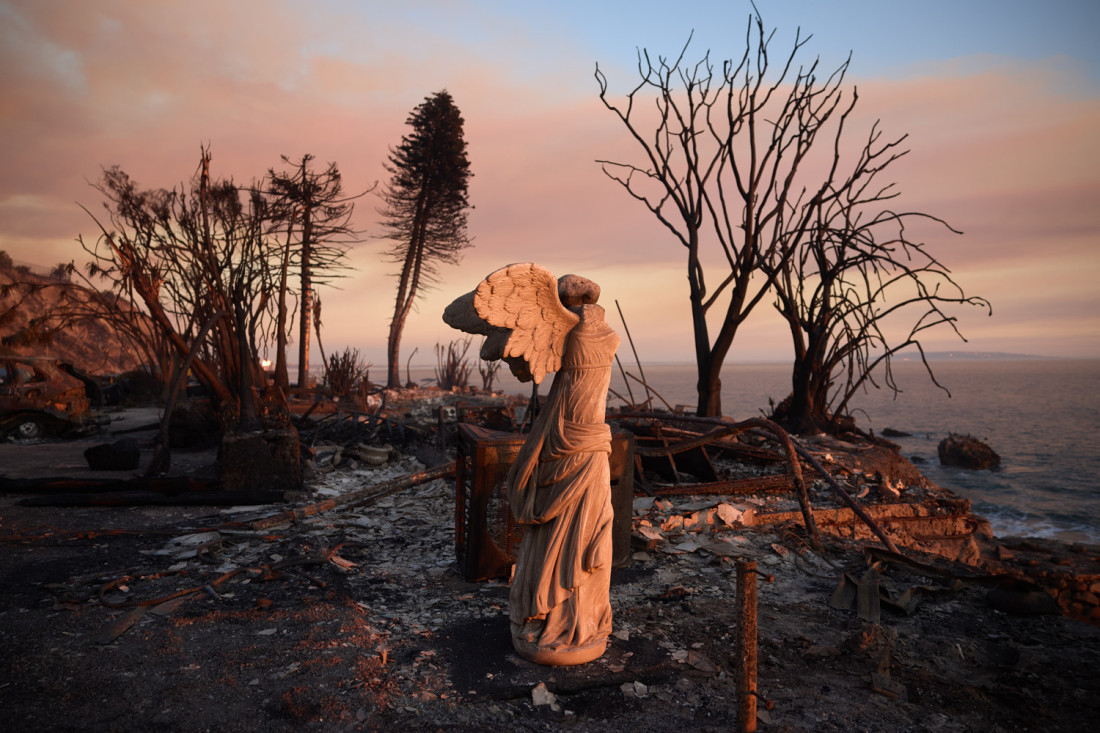 Kip anđela ostaje među ruševinama kuće oštećene u požaru Palisades u Malibuu, Kalifornija, SAD, 10. januara 2025. Foto: EPA/ALLISON DINNER