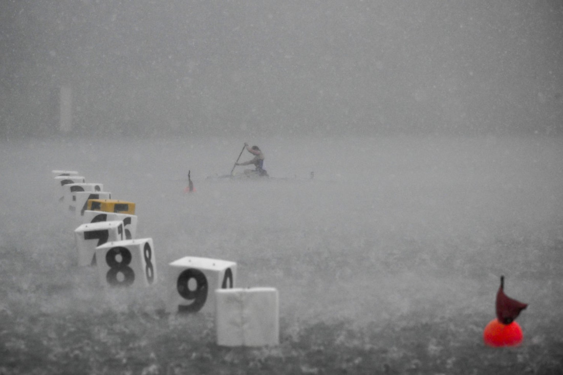 Kanuista se takmiči tokom oluje s gradom na ICF Svjetskom prvenstvu u kajaku i kanuu u Milanu, Italija, 21. augusta 2025. Foto: EPA/Zsolt Czegledi