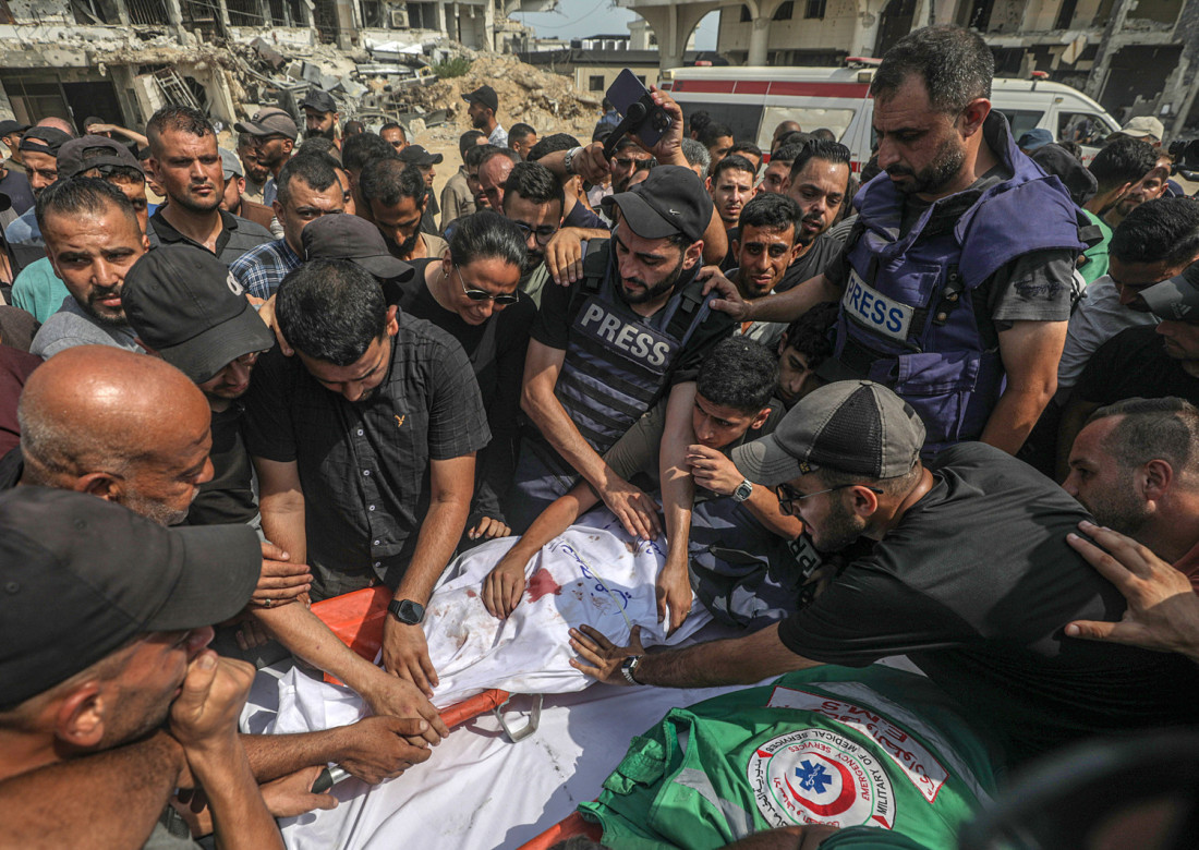 Palestinci prisustvuju sahrani novinara poginulog u izraelskom napadu, ispred bolnice Al-Shifa u gradu Gazi, 11. augusta 2025. Foto: EPA/MOHAMMED SABER