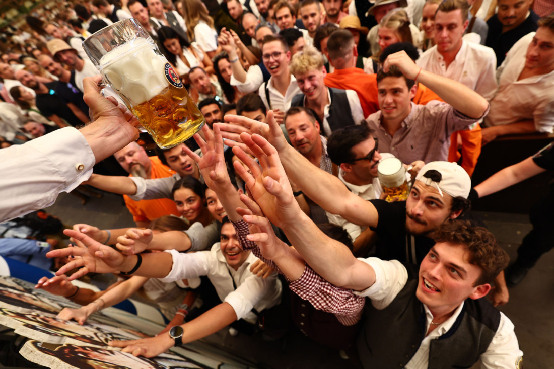 Posjetioci se okupljaju na dijeljenju prvog piva u šatoru pivare Paulaner tokom otvaranja 190. izdanja tradicionalnog festivala piva i zabave Oktoberfest u bavarskoj prijestolnici Münchenu, Njemačka, 20. septembra 2025. Foto: EPA/ANNA SZILAGYI