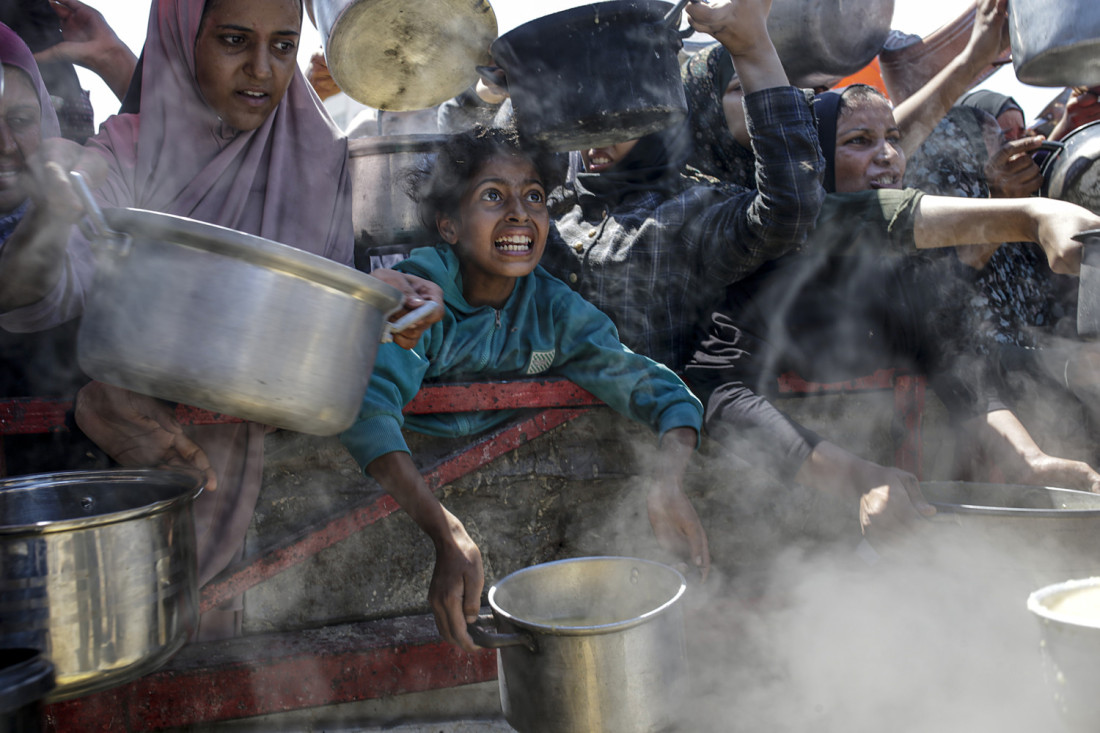 Interno raseljeni Palestinci, uključujući djecu, drže lonce kako bi primili hranu iz dobrotvorne kuhinje u Gaza Cityju, Pojas Gaze, 4. augusta 2025. Foto: EPA/MOHAMMED SABER