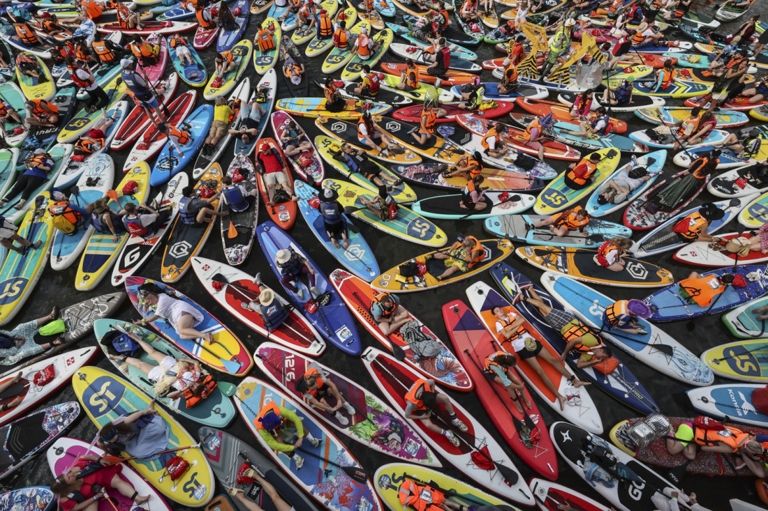 Ljudi prisustvuju velikom kostimiranom festivalu veslanja na dasci (SUP) na rijeci Moskvi u Moskvi, Rusija, 13. jula 2025. Foto: EPA/YURI KOCHETKOV