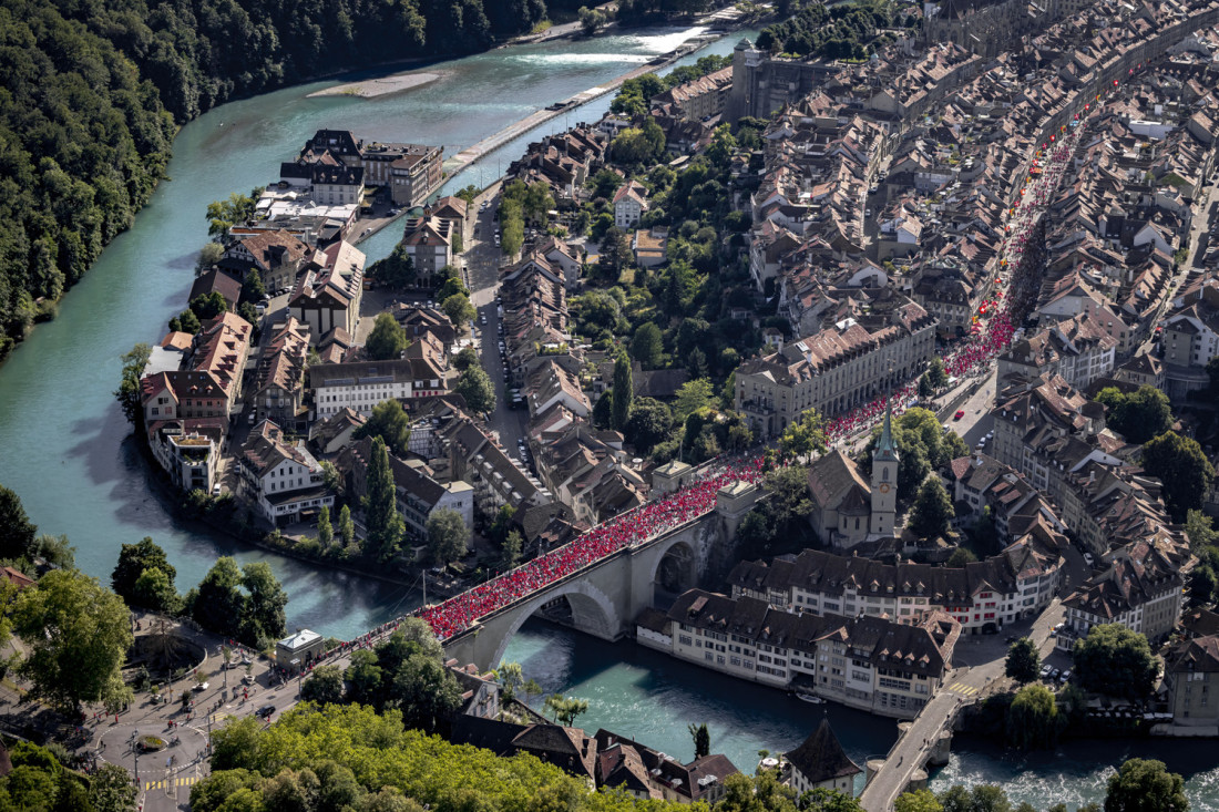 Snimak iz zraka navijača Švicarske koji učestvuju u šetnji prije utakmice četvrtfinala UEFA EURO 2025 fudbalske reprezentacije za žene između Španije i Švicarske u Bernu, Švicarska, 18. jula 2025.