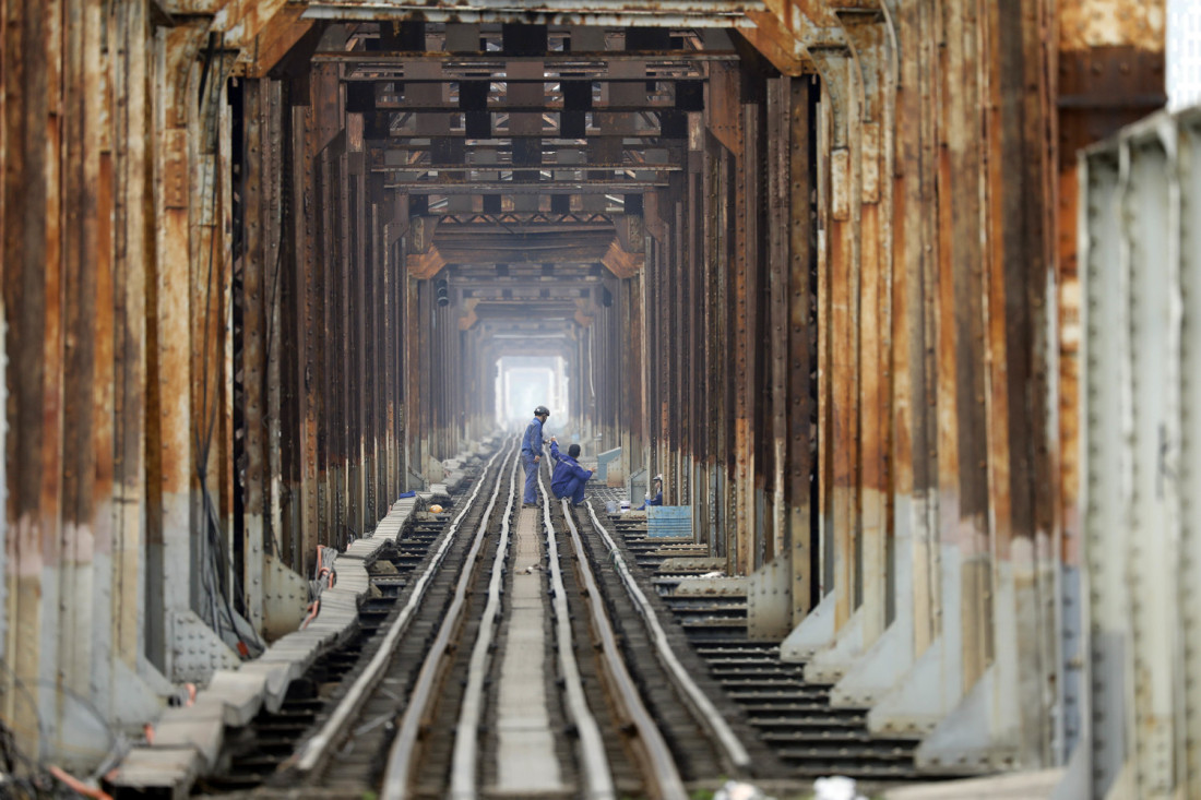 Radnici provjeravaju željezničke tračnice na mostu Long Bien u Hanoju, Vijetnam, 21. april 2025. Foto: EPA/LUONG THAI LINH