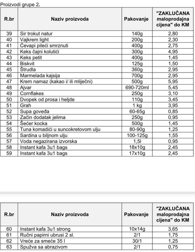 Odlukom je obuhvaćen popis od 63 proizvoda, uz određene korekcije u skladu s aktualnim kretanjima na tržištu. Naime, zamjensko mlijeko za bebe uklonjeno je s popisa zaključanih cijena, s obzirom na to da je u proteklom razdoblju došlo do drastičnog povećanja njegove nabavne cijene, što je onemogućilo daljnju primjenu ove mjere bez poremećaja u opskrbi.