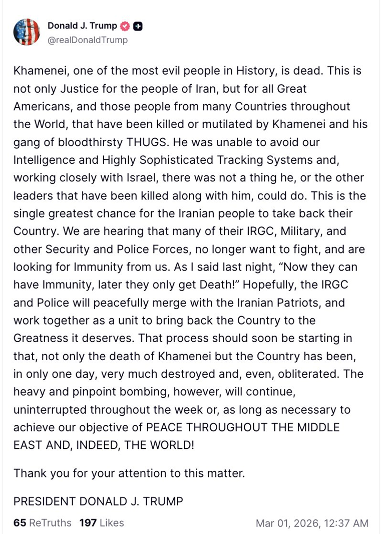Američki predsjednik Donald Trump na svojoj platformi Truth Social objavio je da je vrhovni vođa Irana Ajatollah Ali Hamenei mrtav. U svojoj objavi Trump ga opisuje kao “jednu od najozloglašenijih osoba u historiji” i navodi da je njegova smrt “pravda za narod Irana, Amerikance i ljude širom svijeta pogođene njegovim režimom i njegovom ekipom”.