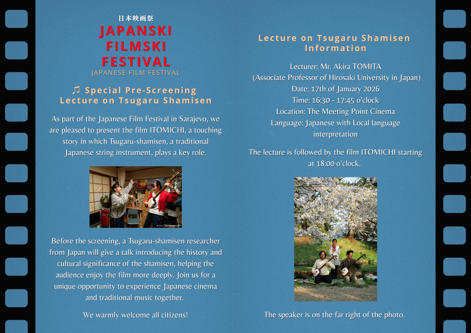 U sklopu prikazivanja filma ITOMICHI, 17. januara održat će se posebno predavanje o „Tsugaru shamisen“. Ovo predavanje omogućit će publici bolje razumijevanje ovog jedinstvenog aspekta japanske tradicionalne muzike i pomoći u dubljem uživanju u filmu.