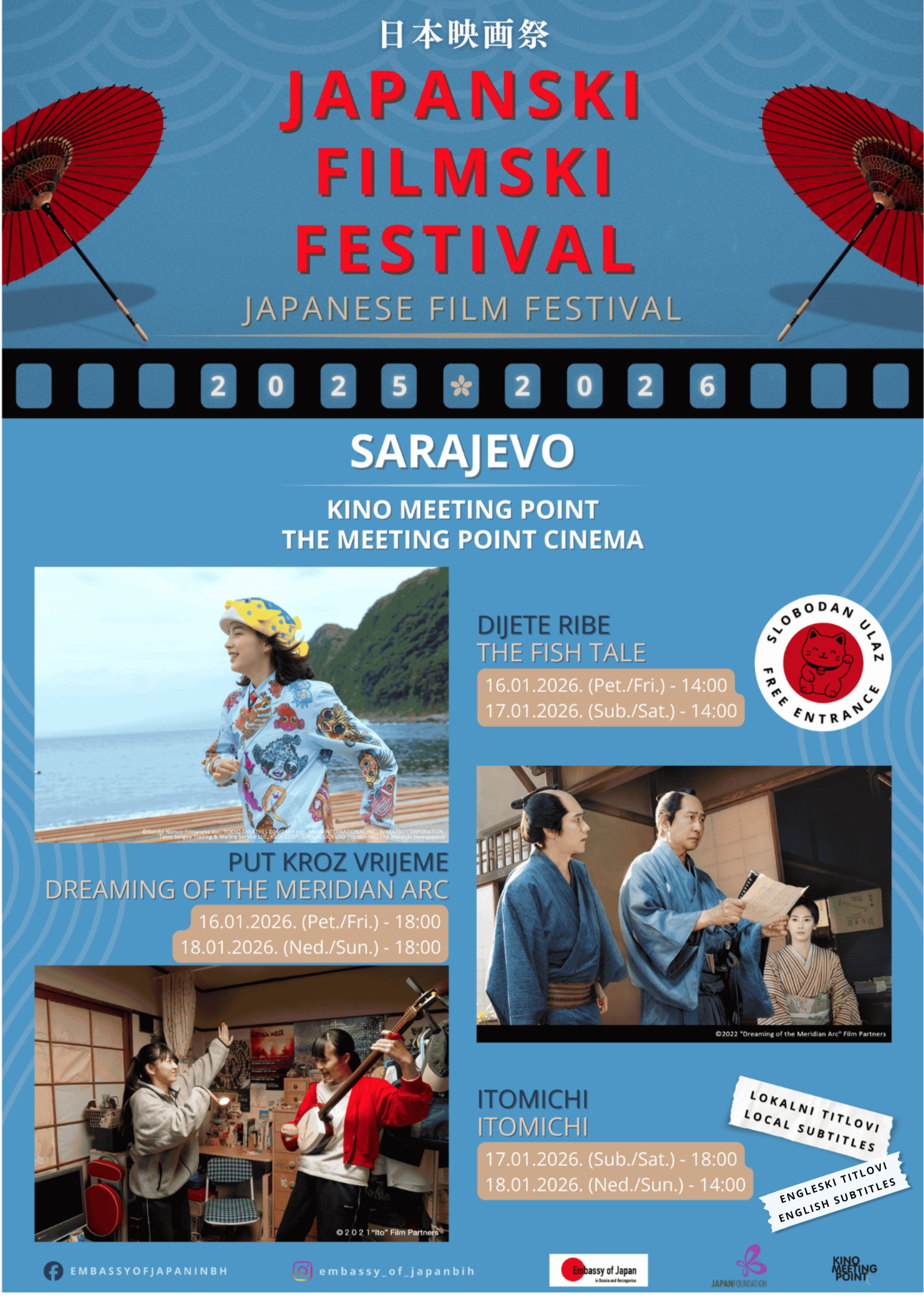 Za dodatne informacije i novosti, molimo posjetite web stranice Ambasade Japana u BiH i Kino Meeting Point.