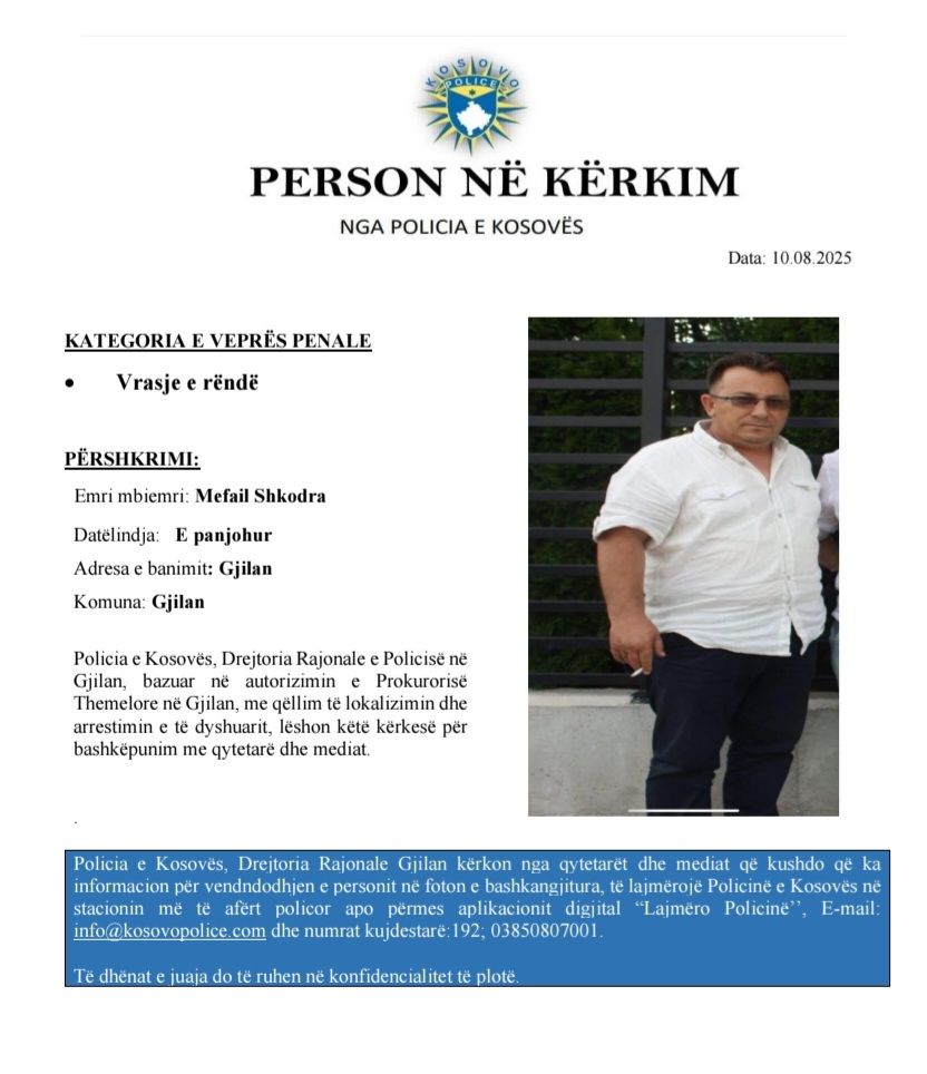 "Kosovska policija, Regionalna policijska direkcija u Gnjilanu, na osnovu ovlaštenja Osnovnog tužilaštva u Gnjilanu, u cilju lociranja i hapšenja osumnjičenog, upućuje ovaj zahtjev za saradnju sa građanima i medijima", navodi se u policijskom saopćenju.