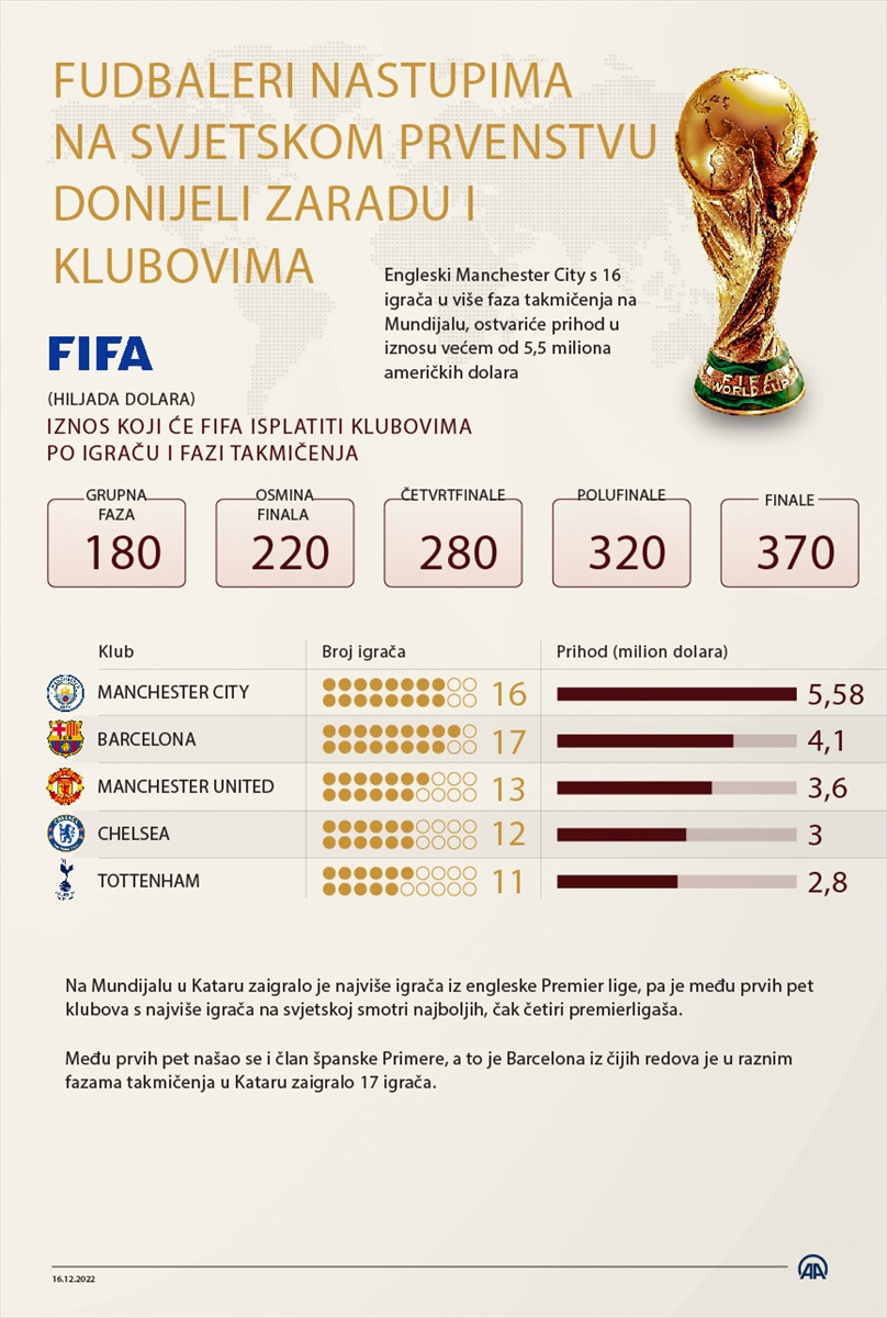 Manchester City će imati najveći udio u okviru programa klupskih naknada. Engleskom klubu, čijih 16 fudbalera je nastupilo na Mundijalu u Kataru, bit će uplaćeno 5,58 miliona dolara.