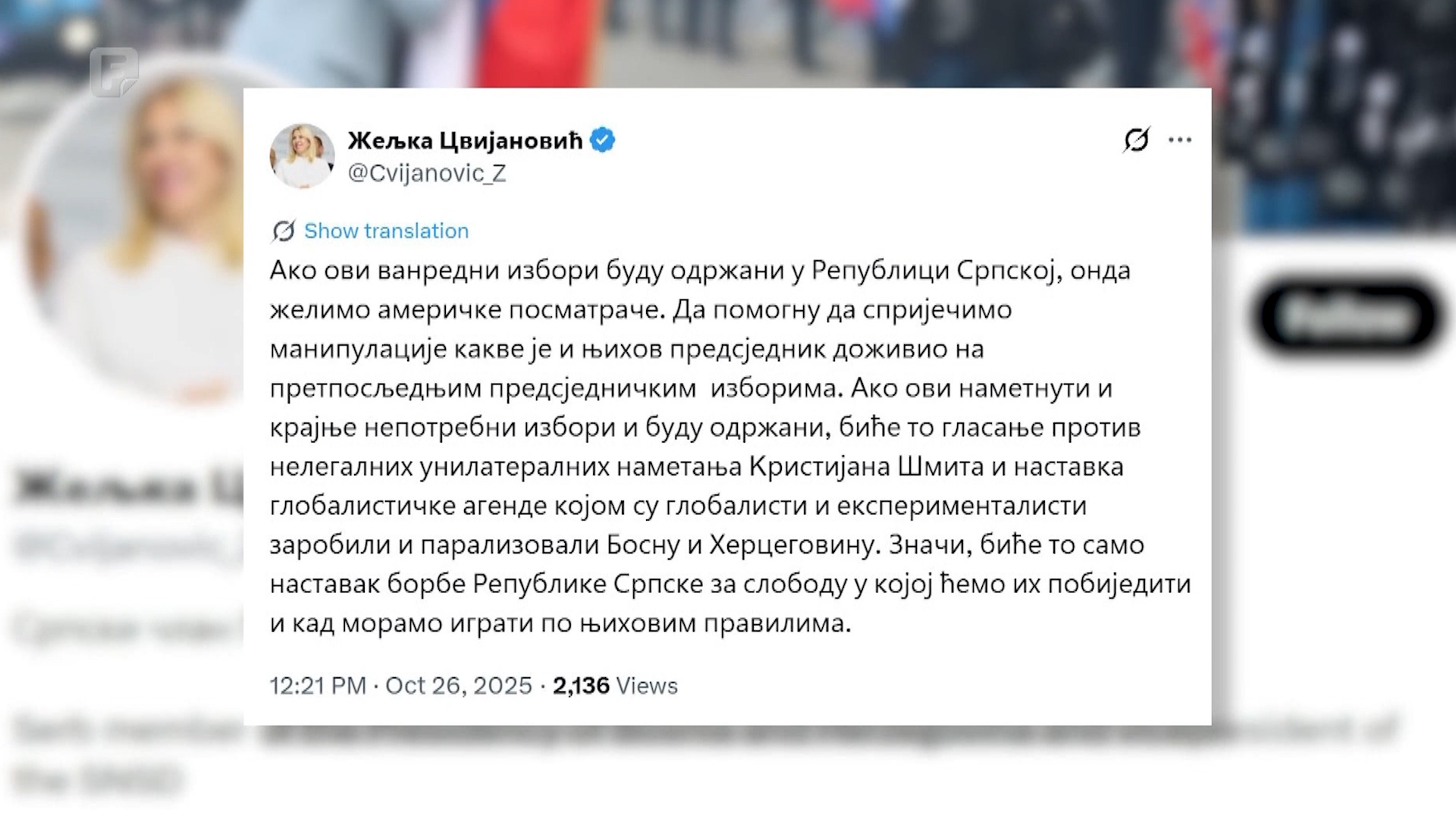 Srpska demokratska stranka reagovala je na objavu članice Predsjedništva Bosne i Hercegovine Željke Cvijanović, koja je na društvenoj mreži X pozvala “američke posmatrače” da spriječe izborne manipulacije tokom predstojećih vanrednih izbora za predsjednika Republike Srpske.