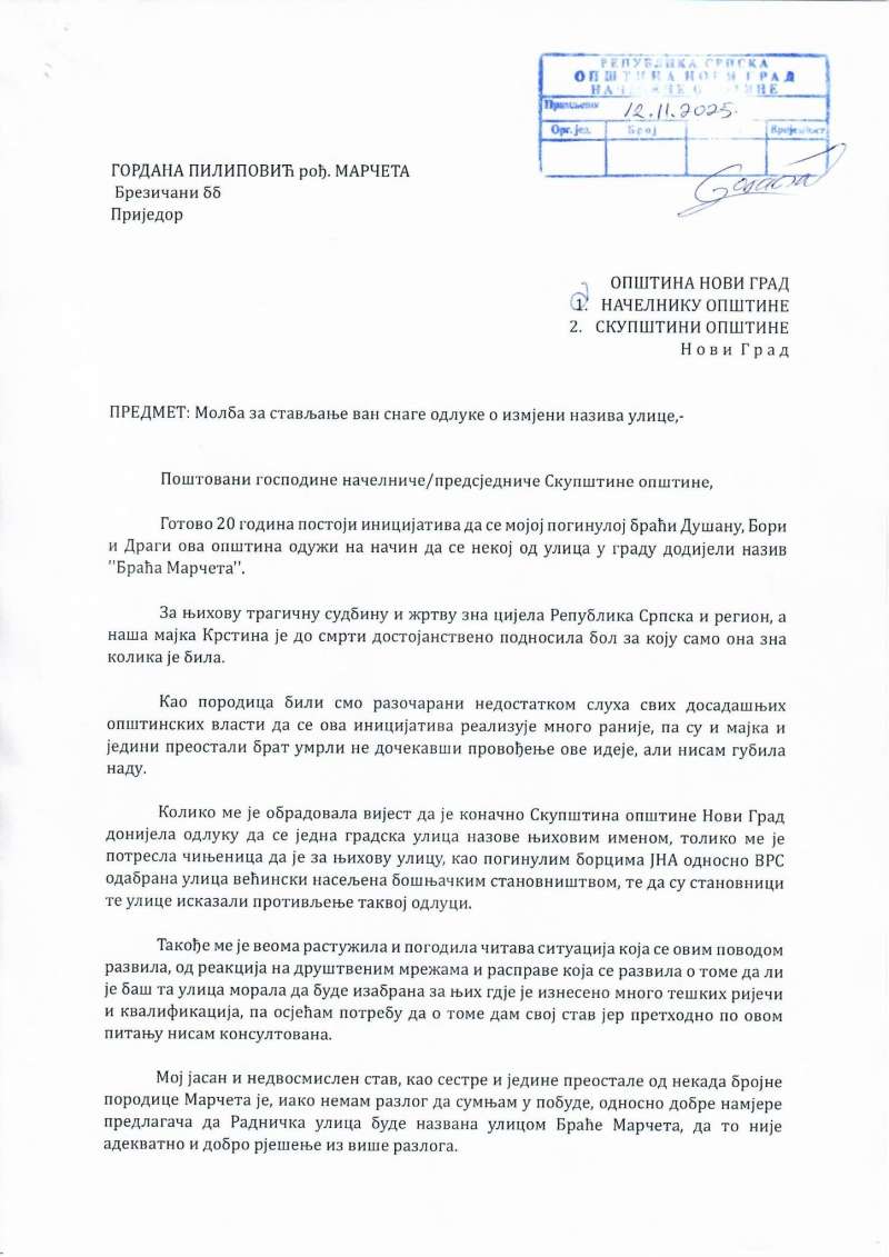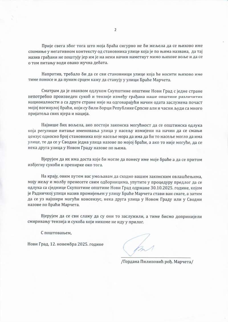 U molbi upućenoj načelniku i Skupštini, Gordana Pilipović podsjeća da ideja o imenovanju ulice po njenoj braći postoji gotovo dvije decenije, ali da je odluka donesena bez njenog znanja i na način koji je izazvao nepotrebne podjele.