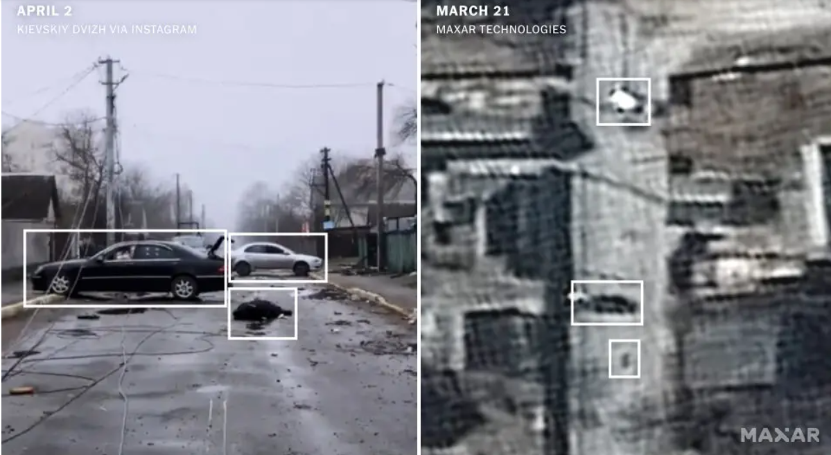 Kako bi potvrdili kada su se tijela tu od kada su ti cvili vjerovatno i ubijeni, tim za vizualne istrage u The Timesu proveo je analizu satelitskih snimaka prije i poslije. Slike prikazuju tamne objekte slične veličine ljudskom tijelu koji se pojavljuju u Yablonskoj ulici između 9. i 11. marta.