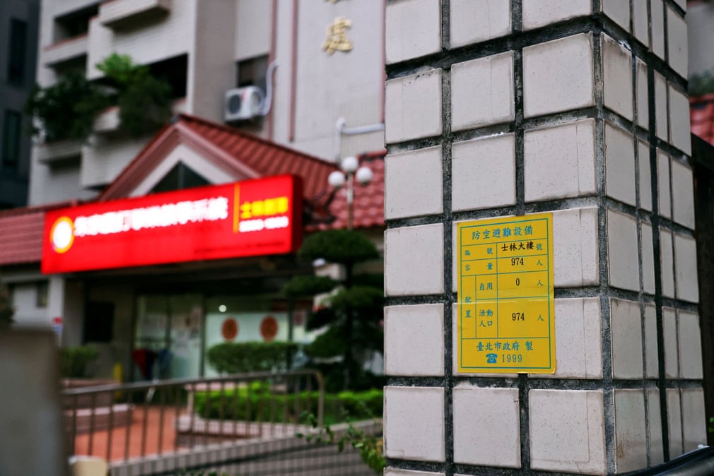 Plakat na zgradi za određeno sklonište od zračnog udara s podacima o maksimalnom broju ljudi koje može primiti. Dužnosnici Taipeija ažuriraju svoju bazu podataka o određenim skloništima, stavljaju njihovu lokaciju na aplikaciju za pametne telefone i pokreću kampanju na društvenim mrežama i plakatima kako bi ljudi znali kako pronaći svoje najbliže.