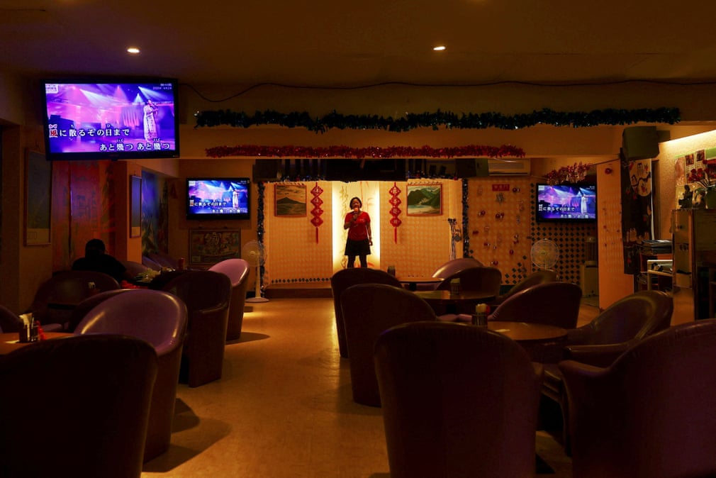 Žena pjeva u karaoke baru u podzemnom prostoru ispod stambene zgrade.