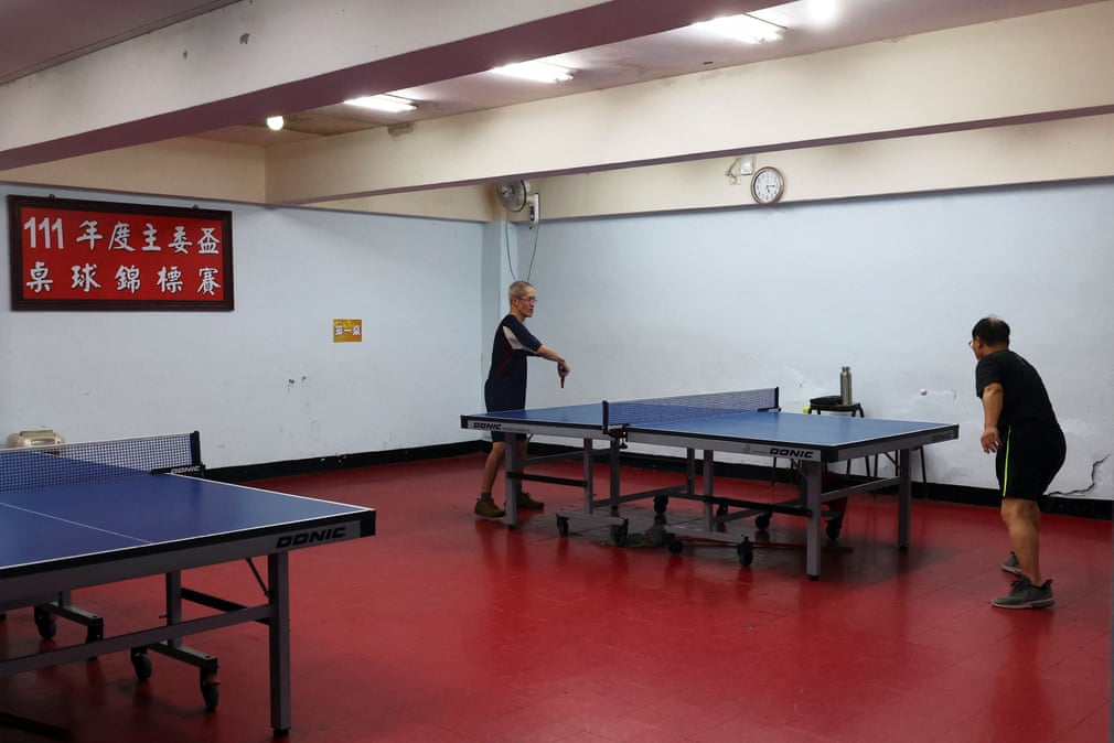 Muškarci igraju stolni tenis u stolnoteniskom klubu u podzemnom prostoru koji bi se mogao koristiti kao sklonište od zračnog udara ispod stambene zgrade u Taipeiju.