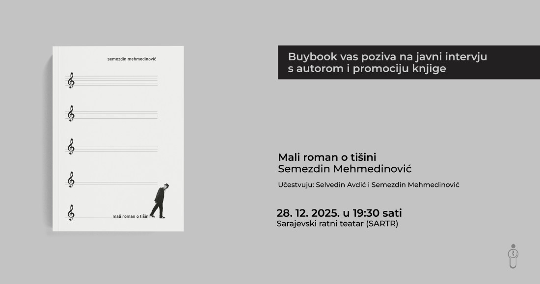 Sarajevski ratni teatar najavljuje javni intervju s autorom i promociju knjige „Mali roman o tišini" Semezdina Mehmedinovića. Događaj će se održati u nedjelju, 28. decembra, u Sarajevskom ratnom teatru (SARTR) u 19:30. S autorom će razgovarati urednik knjige Selvedin Avdić.