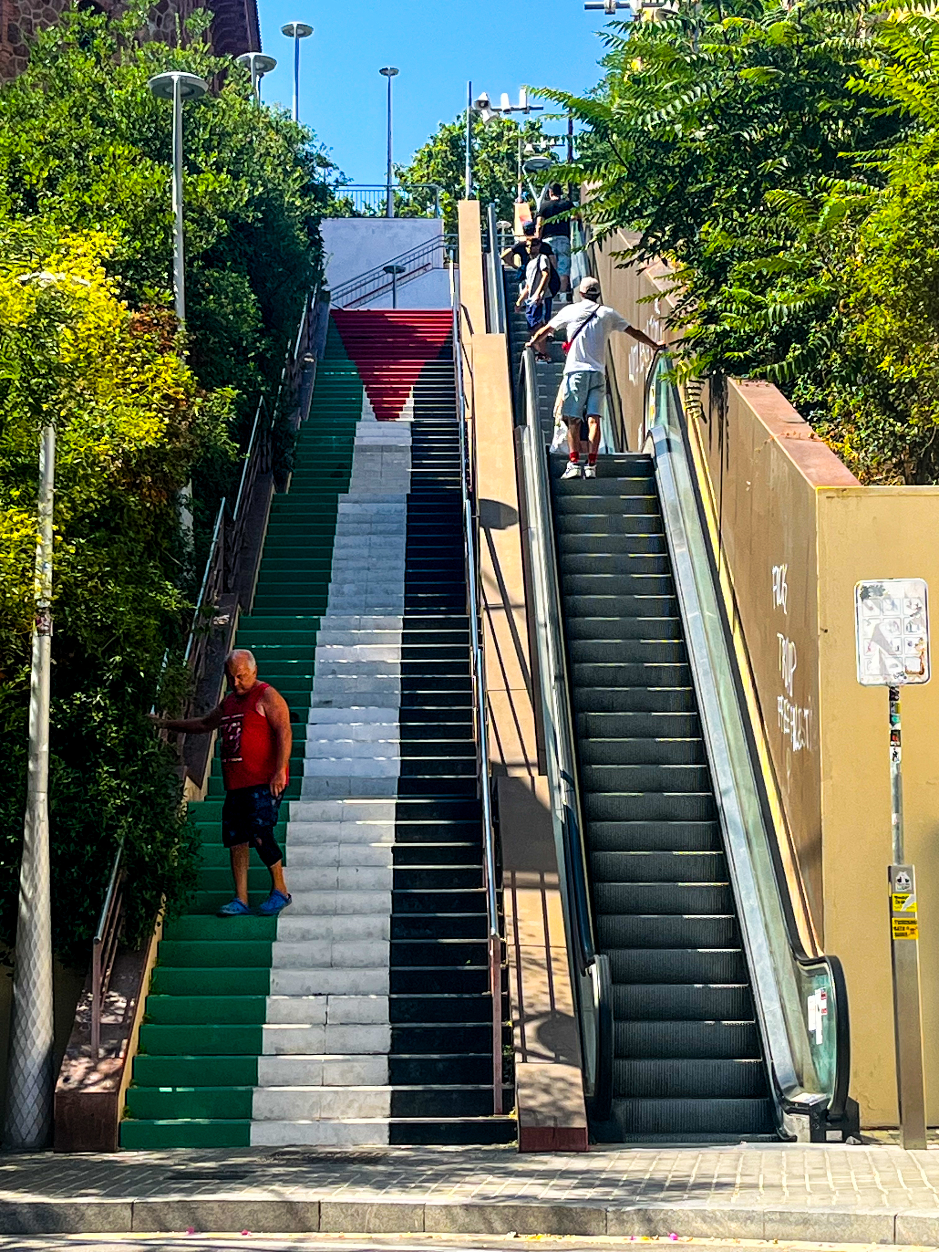Stepenice čuvenog Parka Guell u Barceloni oslikane su u bojama palestinske zastave, pretvarajući jedno od najprepoznatljivijih mjesta u ovom gradu u snažan simbol podrške palestinskom narodu. Svaka stepenica doprinosi stvaranju zastave, a zajedno čine upečatljiv umjetnički prikaz solidarnosti s Palestinom. Ovaj vizuelni performans izazvao je pažnju brojnih posjetilaca parka, koji je jedno od najposjećenijih turističkih odredišta u Španiji.