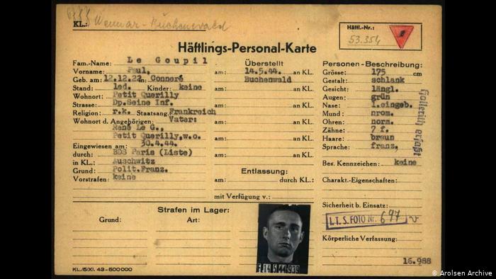 Tako je 21-godišnji učitelj iz Francuske opisan na svojoj "zatvoreničkoj osobnoj kartici" kad je 1944. godine poslan u koncentracijski logor Buchenwald. Izraz "l. Eingebog". vjerovatno znači "blago savijen".