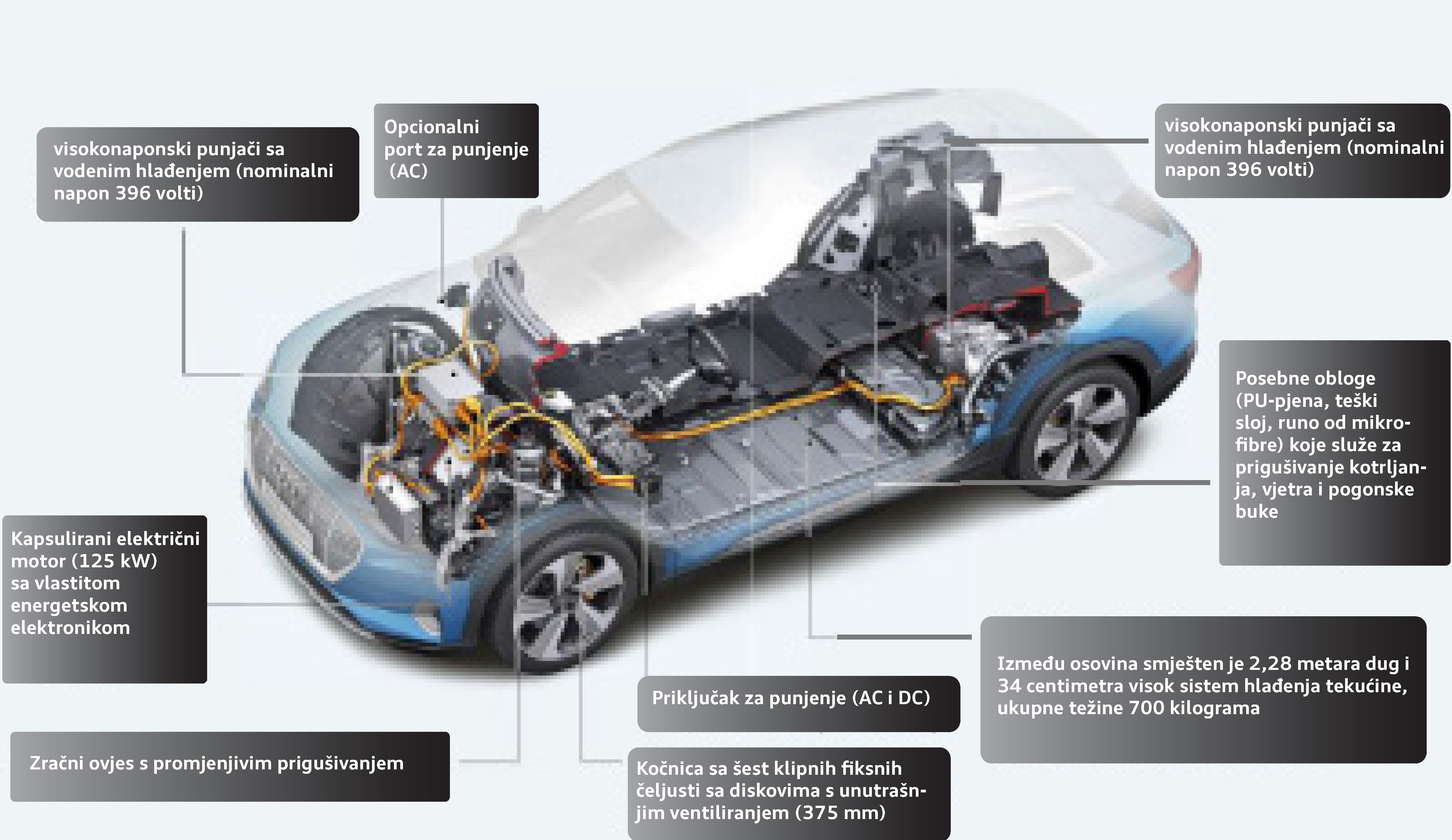 Dva elektromotora, sistemske snage 300 kW i 432 Pouch ćelije, s kapacitetom od 95 kWh: zajedno s Porsche Taycanom i Jaguarom I-Pace, Audi e-tron je trenutno jedan od tehnički najsloženijih modela. Ispod možete vidjeti pogled u unutrašnjost e-trona kao i njegov koncept baterije i pogona.