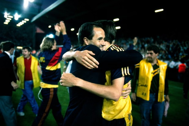 George Graham grli Alana Smitha nakon što je Arsenal osvojio naslov Prve lige na Anfieldu 1989. godine. Foto: Getty Images