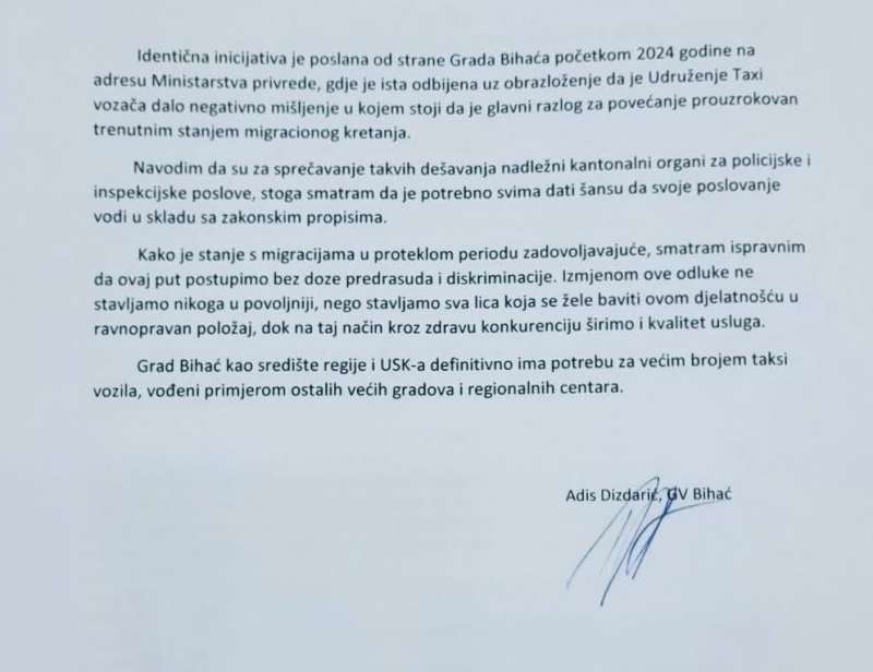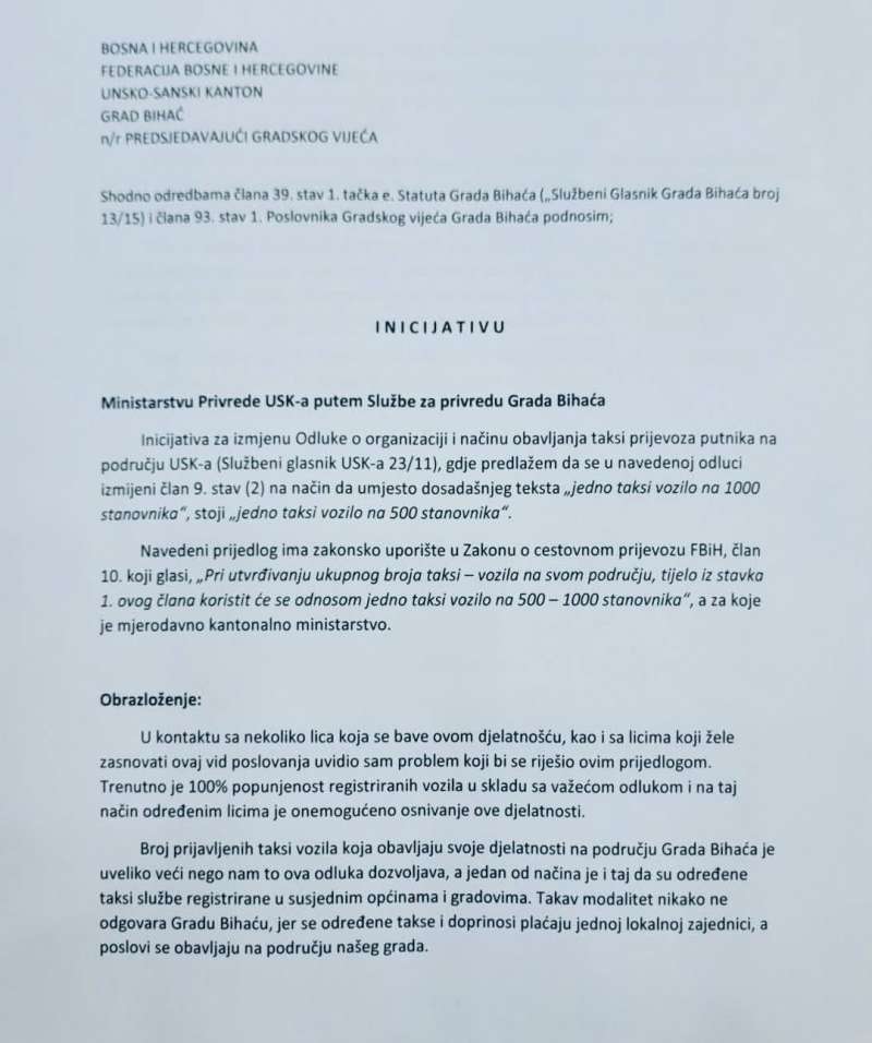 U obrazloženju inicijative navedeno je da je važeća odluka u praksi dovela do stopostotne popunjenosti registrovanih taksi vozila, čime je onemogućeno osnivanje novih djelatnosti u ovoj oblasti. Također je ukazano na problem da značajan broj taksi vozila koja posluju na području Bihaća imaju registraciju u susjednim općinama, što dovodi do situacije u kojoj se prihodi ostvaruju u gradu, dok se porezi i doprinosi plaćaju izvan lokalne zajednice.