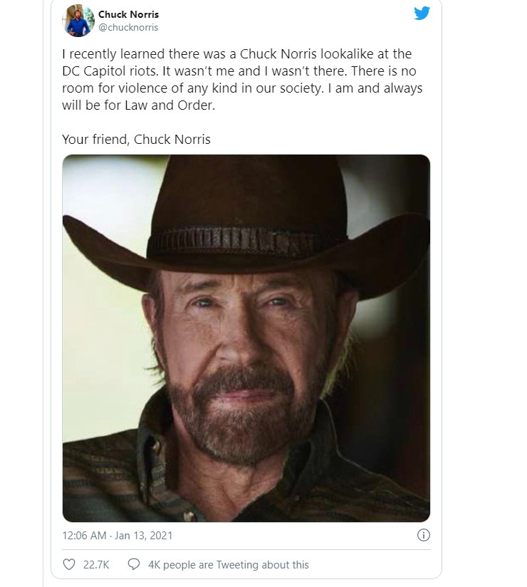 “Nisam to bio ja i nisam bio tamo. U našem društvu nema mjesta za nasilje bilo koje vrste. Ja jesam i uvijek ću biti za zakon i red ”, tweetovao je glumac zauzimajući stav na koji bi njegov lik za provođenje zakona u Walkeru, Texas Ranger bio ponosan.