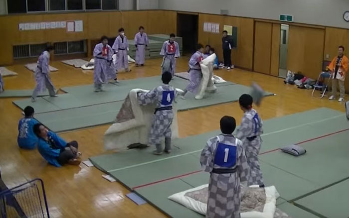 Na slici je japanski nacionalni turnir u borbi jastuka. Borci s jastucima započinju pretvarajući se da spavaju. Ali kada se označi početak, oni se dignu na noge i trče kako bi uzeli jastuk. Mješavina dodgebola i šaha, timovi se gađaju jastucima, štiteći "kralja".
