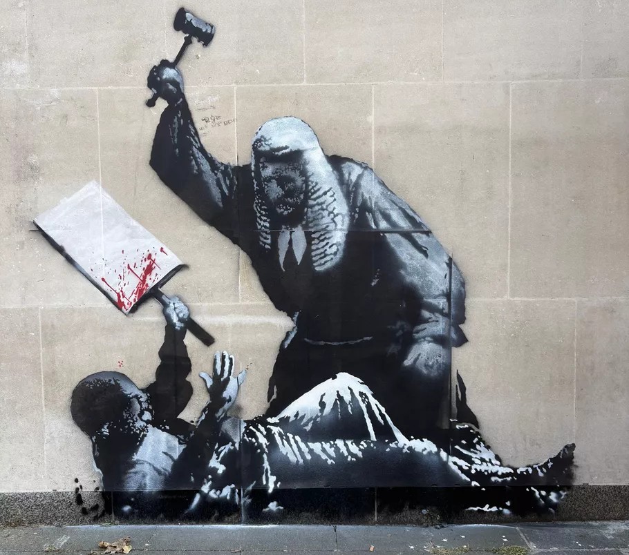 Djelo na Centre Pointu slijedi mural iz septembra u Londonu, koji je prikazivao protestanta kako leži na zemlji držeći krvavu tablu dok ga sudija u paroci i mantiji nadgleda s čekićem u ruci.