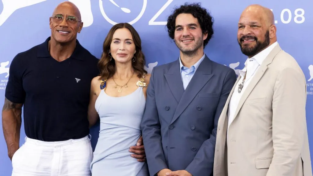 S lijeva na desno: Dwayne Johnson, Emily Blunt, režiser Benny Safdie i stvarni Mark Kerr u Veneciji (Izvor: Getty Images)