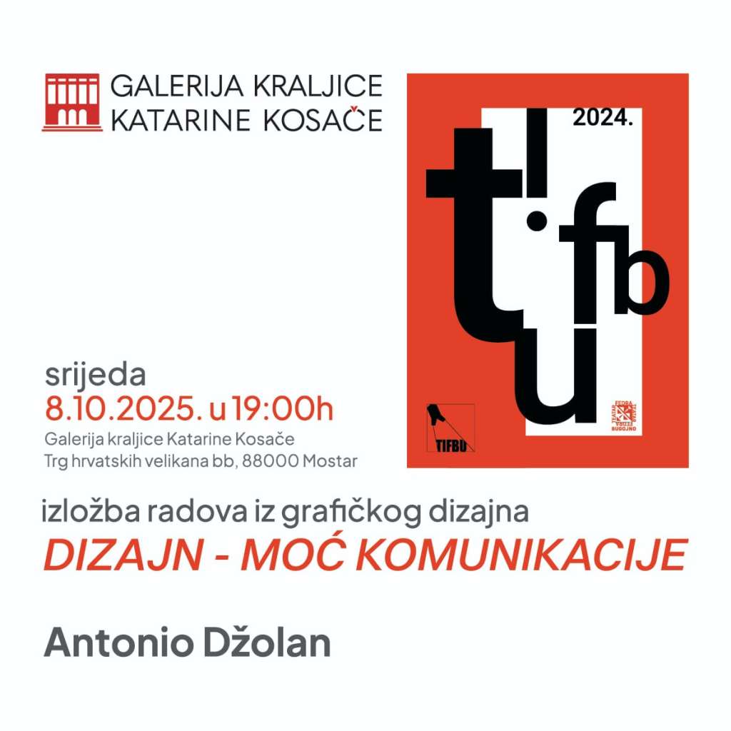 Izložba radova iz grafičkog dizajna "Dizajn - Moć komunikacije" autora Antonija Džolana održat će se u srijedu, 8. listopada, u Galeriji kraljice Katarine Kosače s početkom u 19 sati.