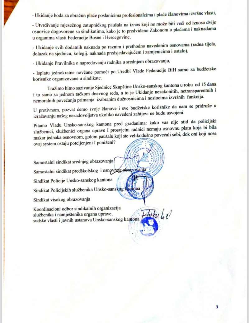 Sindikati zahtijevaju i hitno sazivanje sjednice Skupštine Unsko-sanskog kantona u roku od 15 dana, sa jednom tačkom dnevnog reda – ukidanjem, kako navode, nezakonitih i netransparentnih povećanja primanja izabranim dužnosnicima i nosiocima izvršnih funkcija.