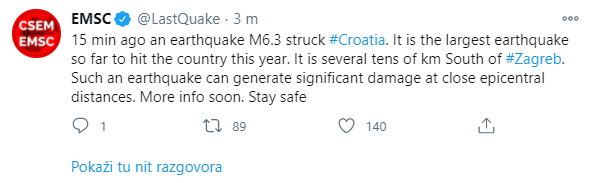 13:45 - Evropski mediteranski seizmološki centar (EMSC) procijenio je u utorak da je potres u Petrinji magnitude 6.3 prema Richteru osjetilo šest miliona ljudi. Program opasnosti od potresa američkog Geološkog zavoda (USGS) pak je procijenio je da se potres u Hrvatskoj osjetio u Bosni i Hercegovini, Češkoj, Njemačkoj, Mađarskoj, Italiji, Crnoj gori, Rumunjskoj, Slovačkoj, Sloveniji, Srbiji i Austriji.
