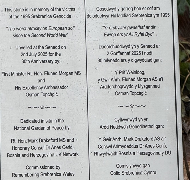 U Nacionalnom vrtu mira u Cardiffu održano je otkrivanje Kamen-spomenika Srebrenici, čime je obilježen važan trenutak u kontinuiranoj posvećenosti Walesa kulturi sjećanja, obrazovanju i prevenciji genocida.